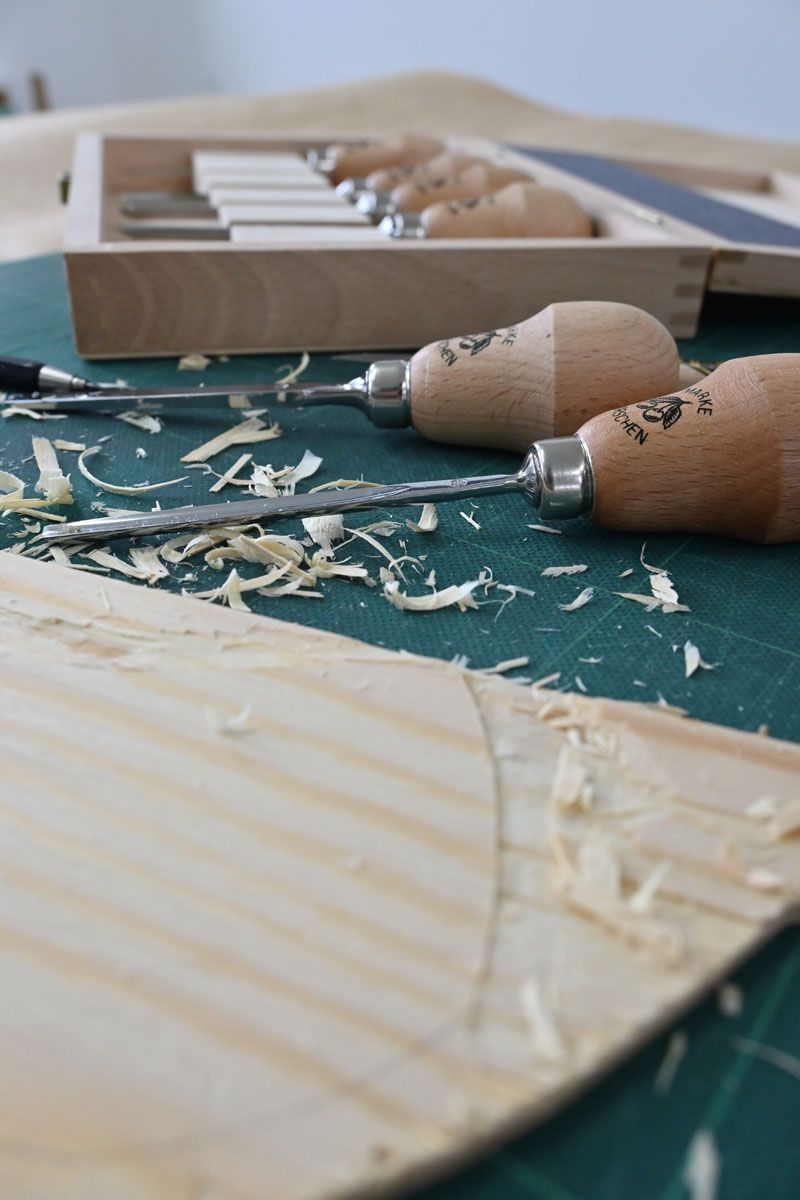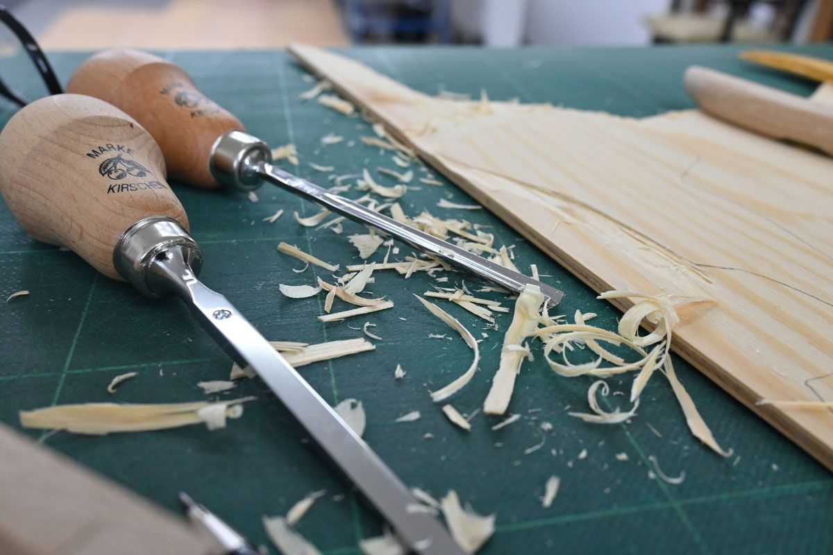 This 6-piece carving chisel set features carbon steel blades and pear-shaped wooden handles for precise control. Perfect for lino and softwood carving, it includes six blade shapes to suit various detailed tasks. The set comes neatly stored in a natural wooden box for easy organization and transport.