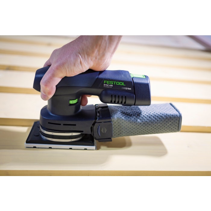 The new RTSC 400, DTSC 400, ETSC 125 cordless compact sanders ensure unparalleled mobility and ease of movement when working. The powerful 18 V battery pack with 3.1 Ah guarantees power similar to that of a mains-powered tool. And it is the key to an extremely compact design with balanced weight distribution and perfect ergonomics with a weight of just 1.4 kg. The integral dust extraction system, in combination with the long-life dust collection bag, enables the machine to be used flexibly – effortlessly even overhead, vertically or in hard-to-reach areas. The battery pack can be replaced with the plug it-mains adapter to achieve an unlimited running time – ideal for stationary applications and in combination with a Festool mobile dust extractor.
