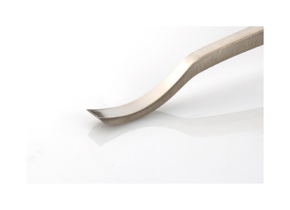 A short bent chisel with a flat edge, designed for fine shaping and leveling in tight or recessed areas where straight tools cannot reach.