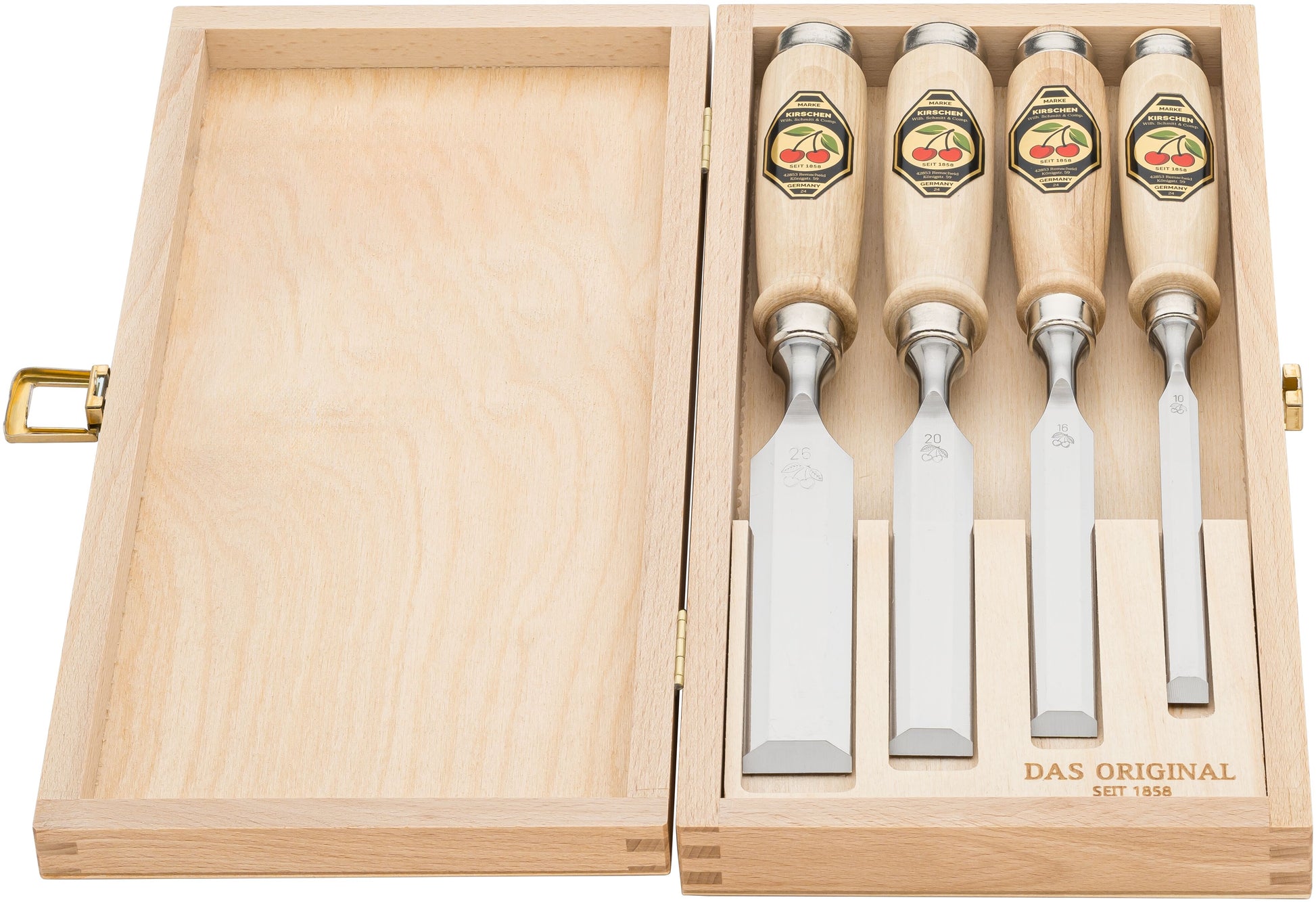 A quality 4-piece bench chisel set with traditional timber handles, neatly stored in a durable wooden box—ideal for workshop use or as a gift.