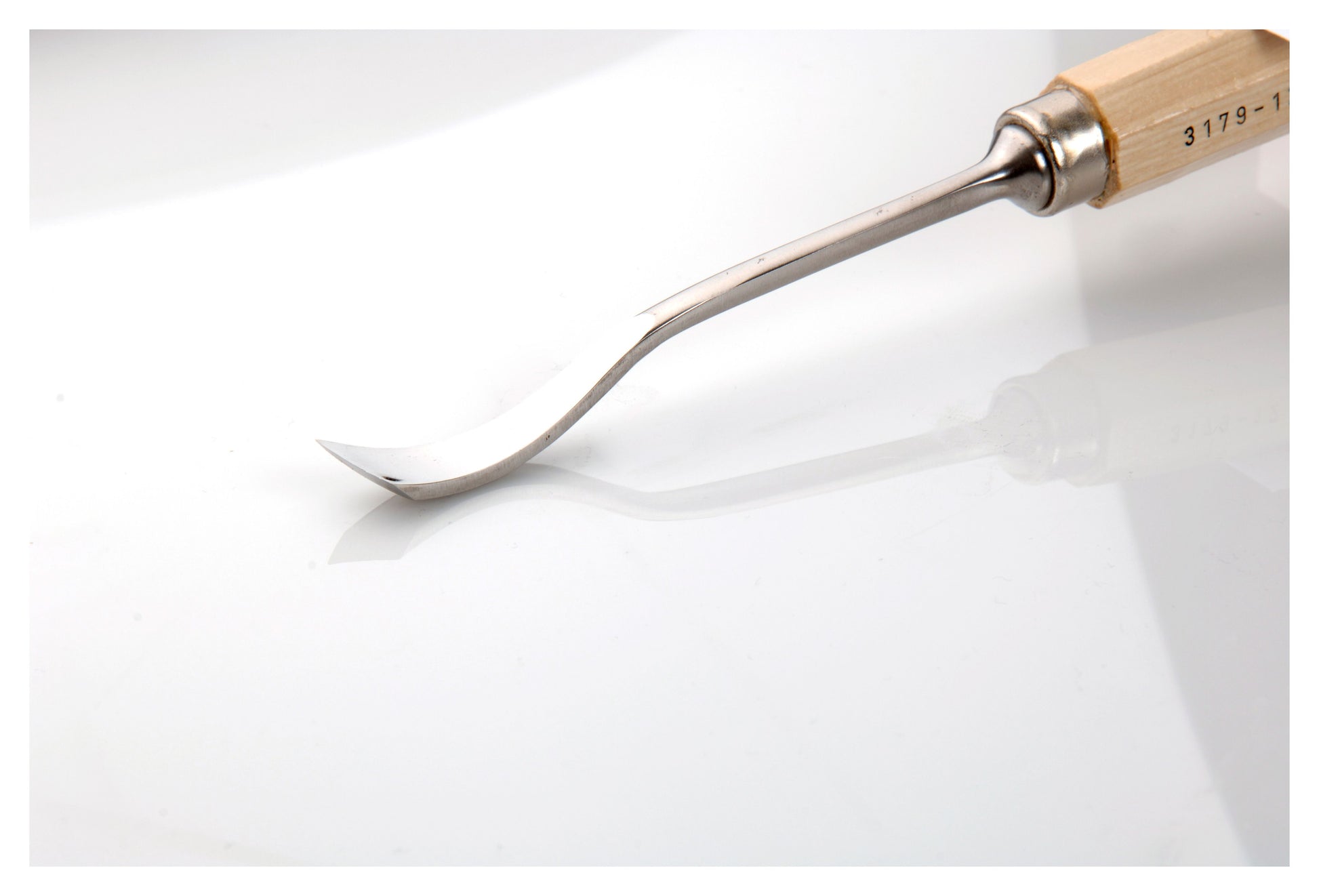 A short bent left-hand skew gouge with a #4 sweep, designed for smooth, angled carving in recessed or curved areas from the left-hand side.
