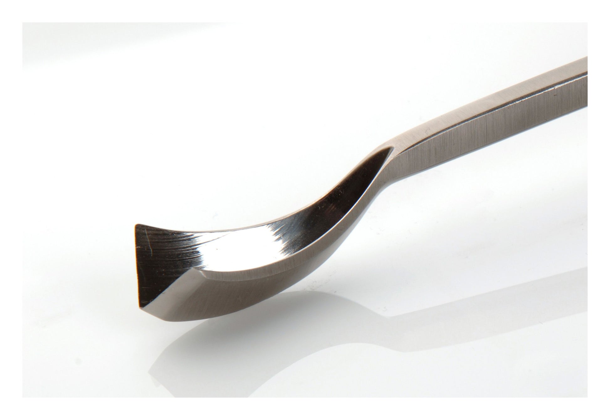 A short bent V gouge with a #39 sweep, designed for detailed V-shaped carving and fine grooves.